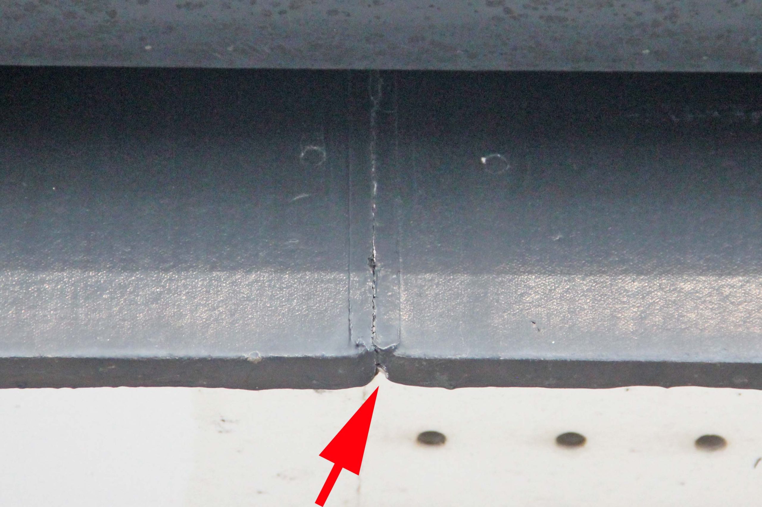 樋も箇所によりやや変色やジョイント部分に隙間が有り雨水が流れ出た痕が見られました。材質そのものもやや脆くなって来ていました。これは加水分解によるものです。加水分解と言うのは水と反応して分解を起こしてしまう事で、空気中の窒素、紫外線、微生物、空気に含まれる水分等で起きてしまいます。