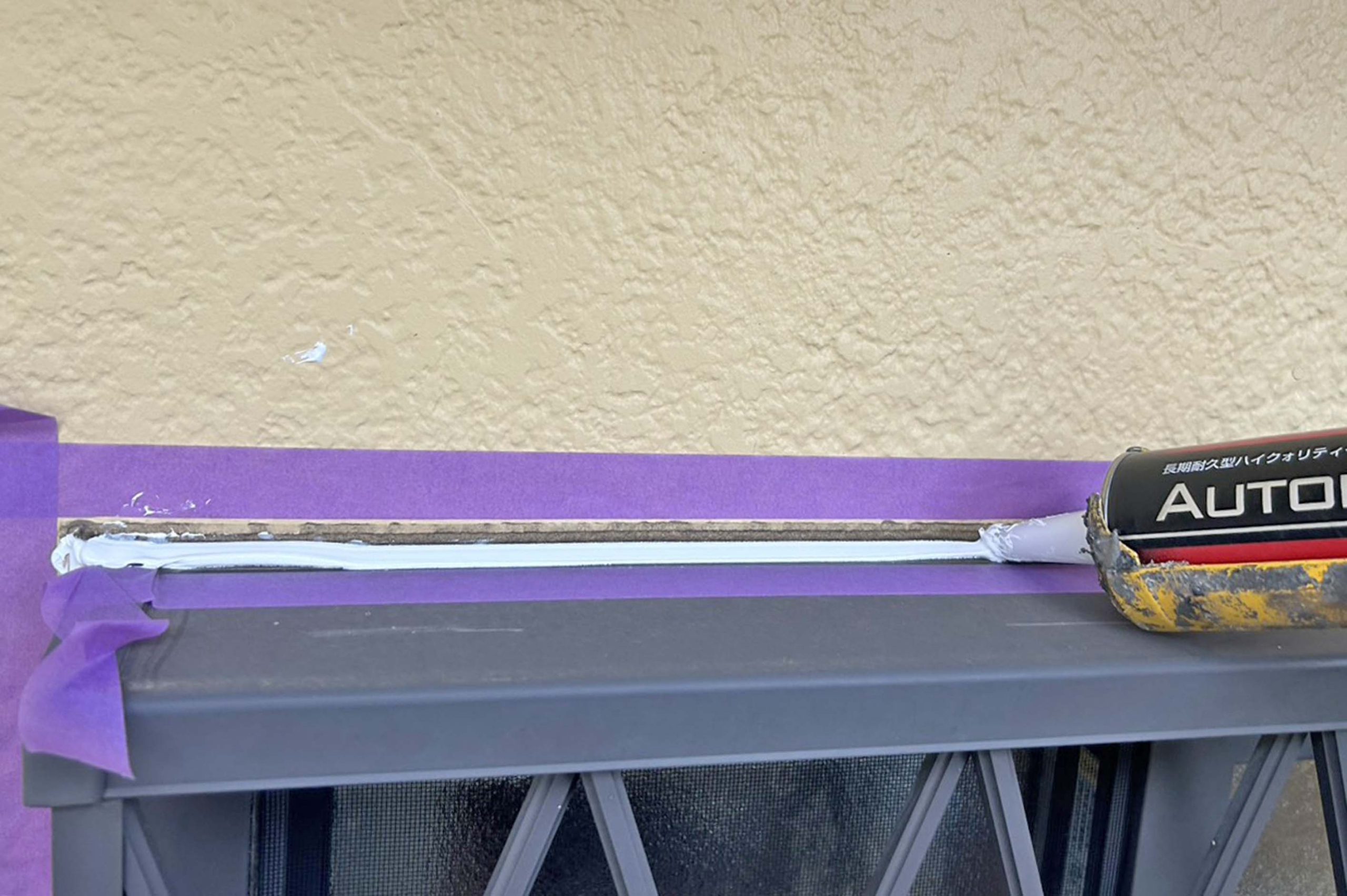 外壁塗り潰し部分はサッシ周りと入隅のシーリングが完了しました。入隅というのは外壁やサッシ等の取合が凹んでいる角の部分の事で物理的にコーキングを撤去出来ない箇所になります。これ等の部分はコーキングを上から充填します。この方法を打増と言います。