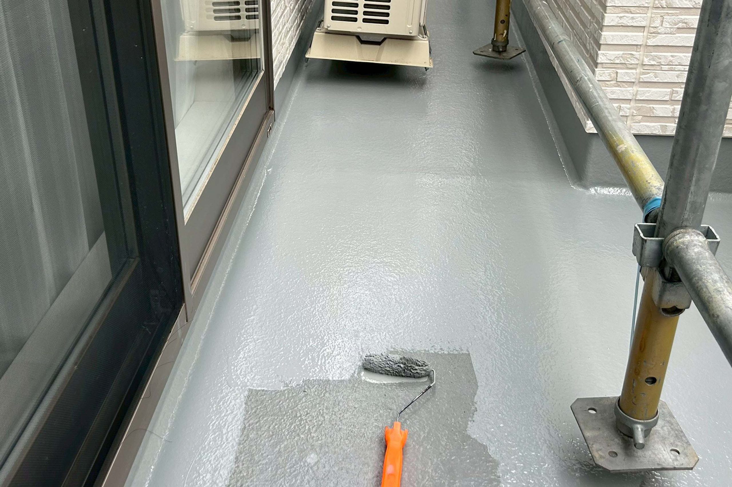 さいたま市見沼区のS様邸は釘浮き箇所のコーキングと頭留、樋のジョイントシーリング・ケレン・塗装、玄関上の笠置のジョイントコーキング、水切り・シャッターボックスの下塗り、コーキングの目地撤去・打ち替え、養生の解体、2階周りの清掃が完了し、バルコニーのFRP(繊維強化プラスチック)防水床のトップコートが途中です。