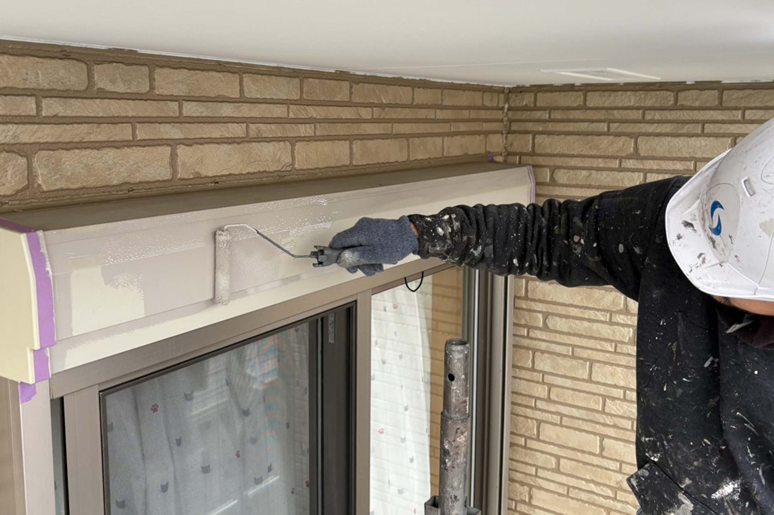 霧除け・シャッターボックス・水切はスチール製でかなり変色が見られましたが錆び等は出ていませんでした。こちらもしっかり目荒らししてからクリーンマイルドシリコンのサッシの近似色で塗りかえました。こちらも輝きを取り戻しました。