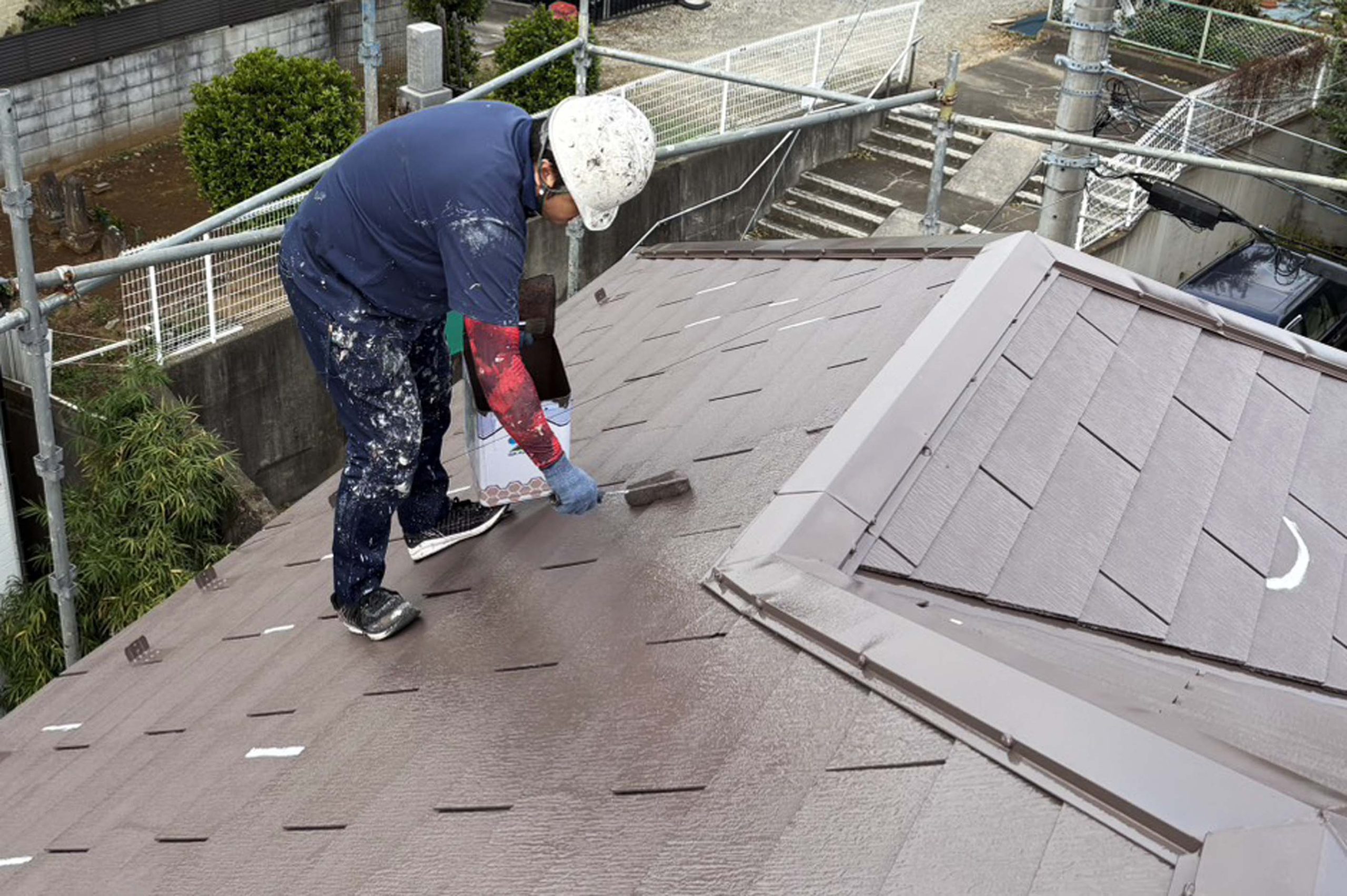 大屋根は前回エスケー化研株式会社のマイルドシーラーEPOホワイトで下塗と、同社のクールタイトシリコン/CLR-108 アイビーブラウンで中塗まで完了しており、今回は上塗りを行いました。