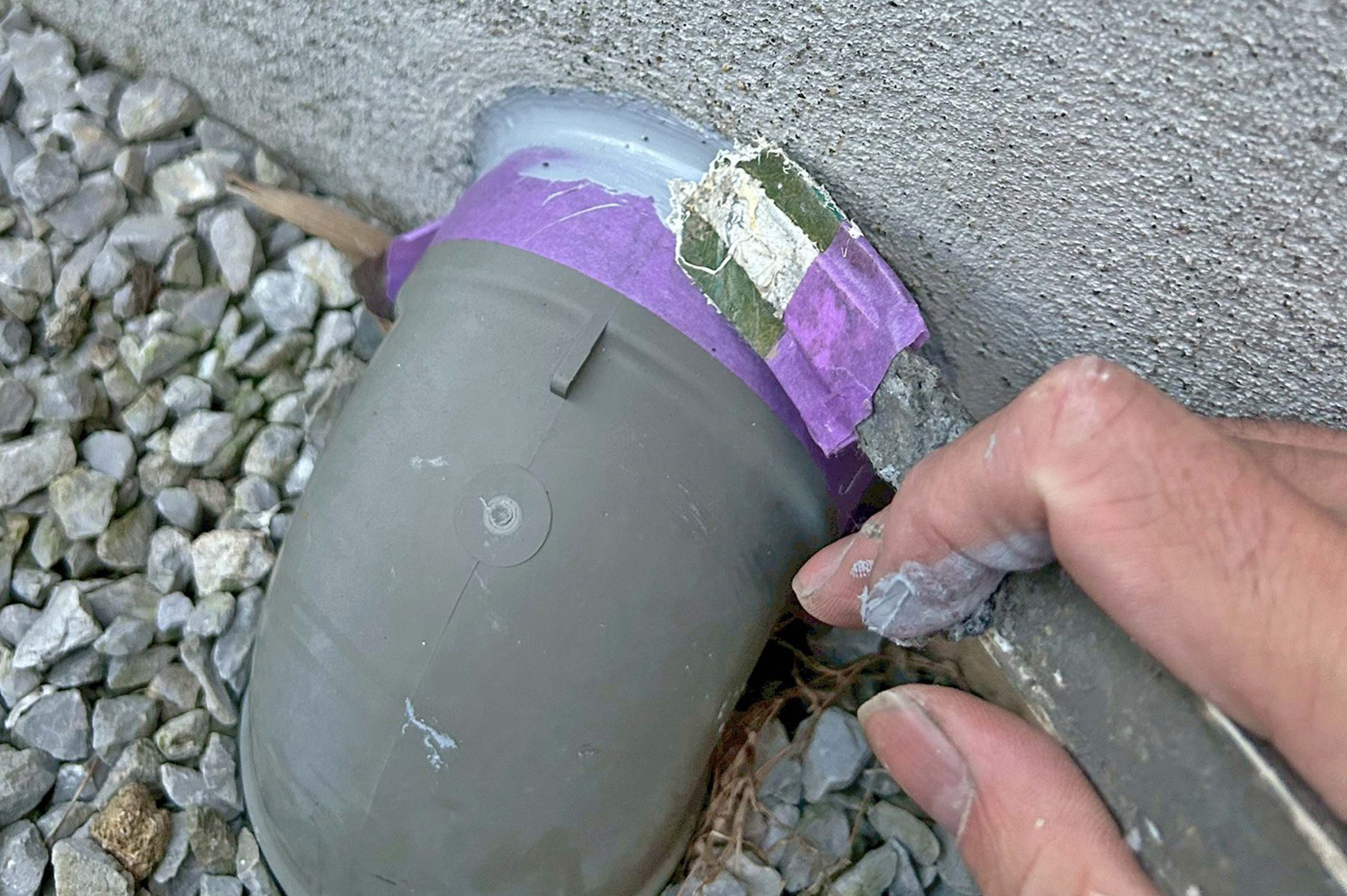 基礎から出ている塩化ビニールの配管周りはシーリングを行いました。シーリングというのは竣工時にはもちろん、経年劣化や建物が歪んだ時にできる隙間や穴、ひび割れ等が生じて雨水が侵入し易い箇所をコーキング等で埋めて塞ぐ事です。