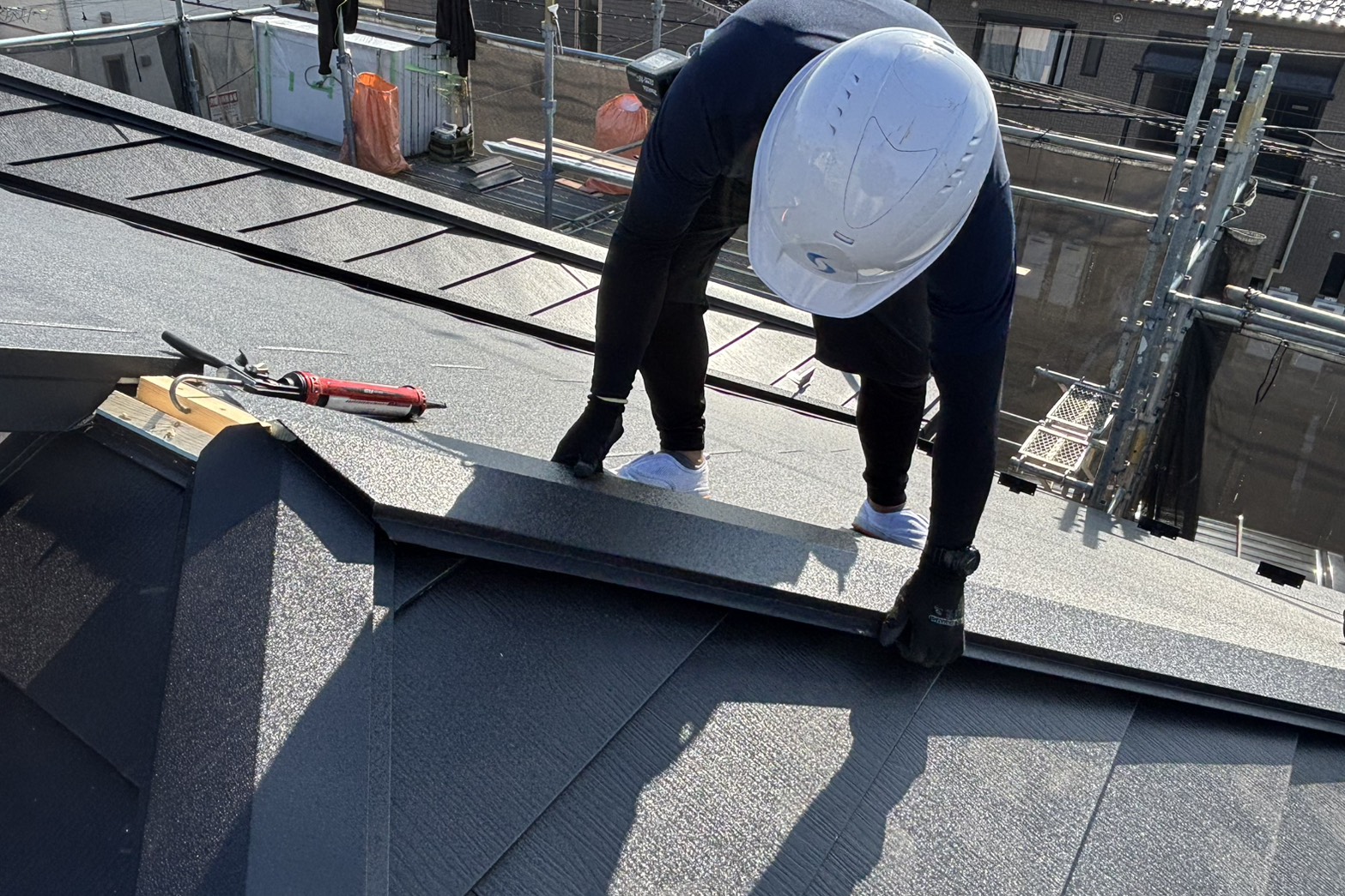 大屋根と下屋根はアイジー工業株式会社のスーパーガルテクト/黒色で取付が完了しました。その他の役物も純正品を使用しました。