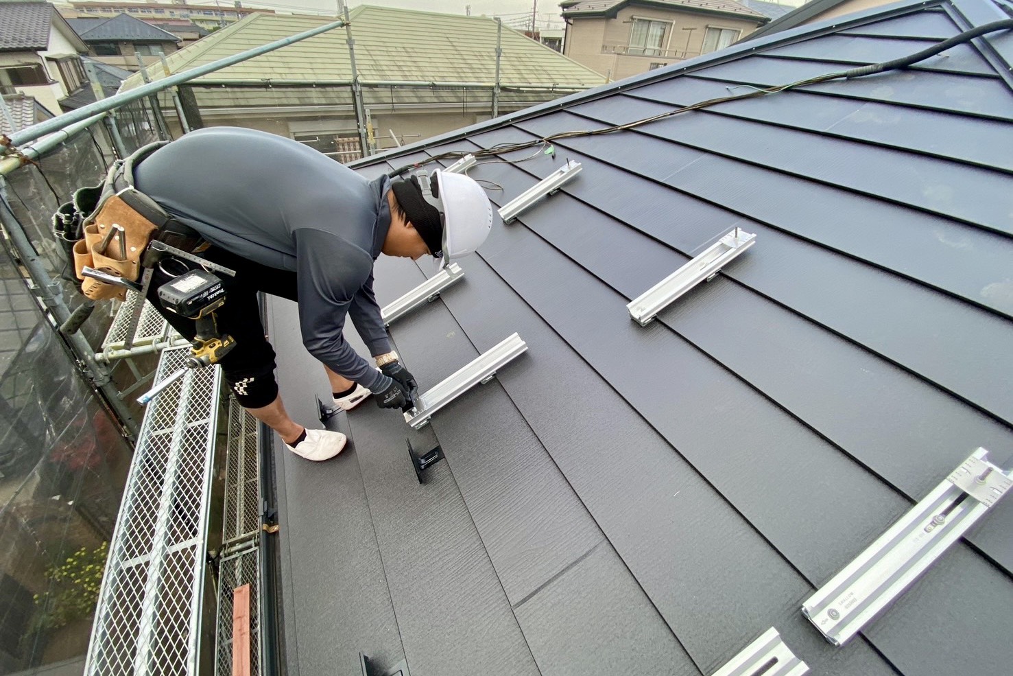 屋根の葺替のために一時的に撤去していた太陽光バネルを復旧しました。太陽光バネルを固定するための金具は屋根材を挟み込んで取付けしました。屋根に穴を空けて取り付けると雨もりの原因になるからです。