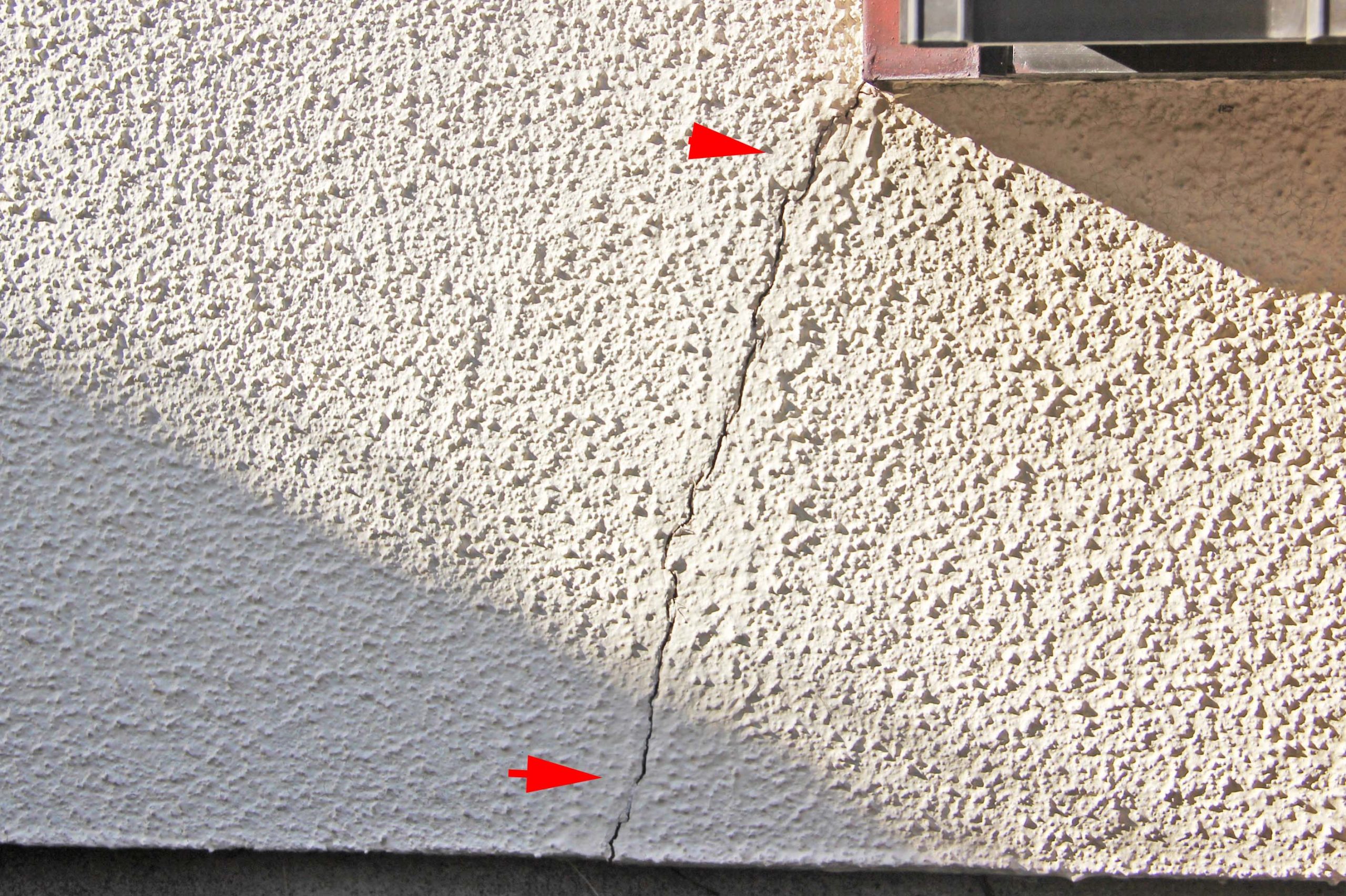 外壁にはあちこちひび割れの補修箇所が見られました。新たなひび割れも発生していてこの状態ですと雨水が内部へと侵入してしまいます。欠損箇所も見受けられました。