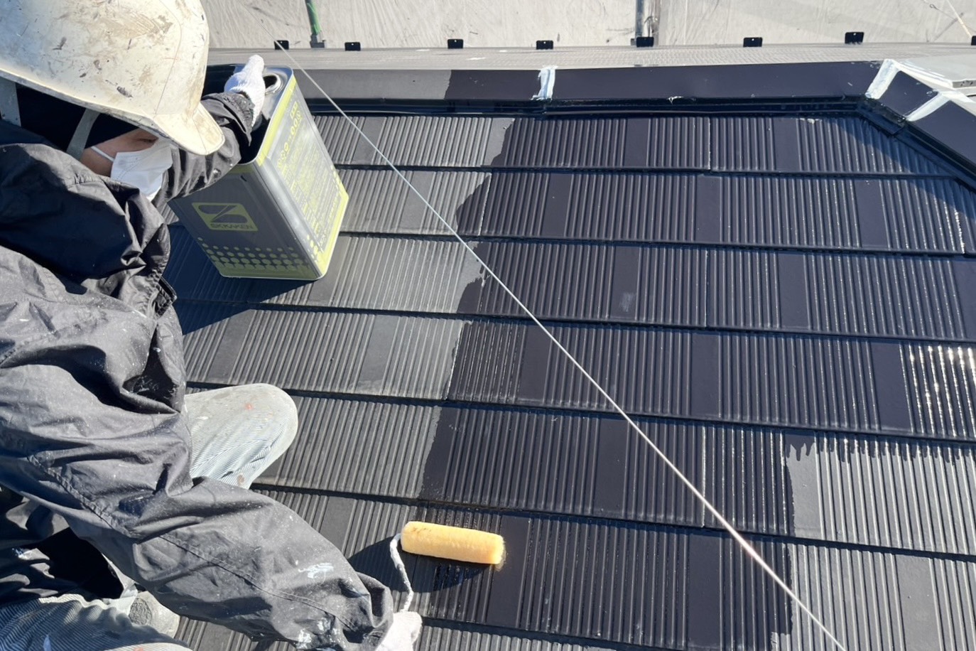 屋根はシーラーで下塗が完了しました。シーラーは傷んだ箇所に良く染み込んで補強をし、微細なひび割れも塞ぎます。また仕上塗料との接着を良くする働きが有ります。