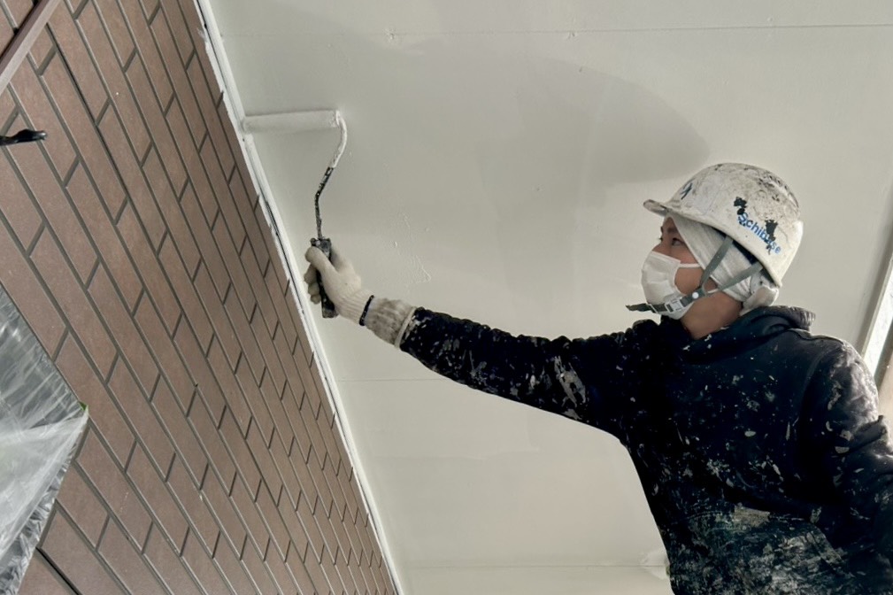 軒天は日本ペイント株式会社のケンエースGⅡ/艶消し白色で塗りかえが完了しました。艶消しの白色は光が乱反射してお住まい全体がとても明るくなりました。外壁とのコントラストもときれいになる筈です。