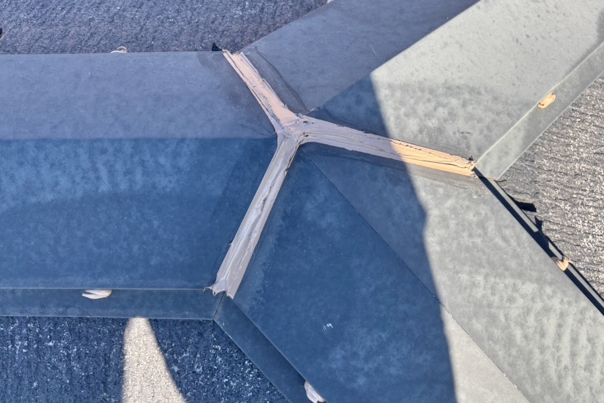 屋根板金のジョイントのシーリングと釘浮補修、コーキングによる釘頭の接着が完了しました。