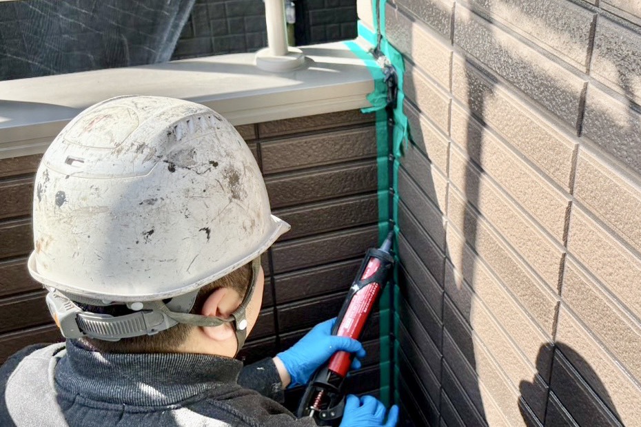 オート化学工業株式会社のオートンイクシードで、縦目地は打替え、入隅は打増しを行いました。オートンイクシードは新たに開発された特殊高耐久ポリマー「LSポリマー」を配合することにより国内でもトップクラスの耐久性、耐候性の「超寿命シーリング材」で評判の良い製品です。